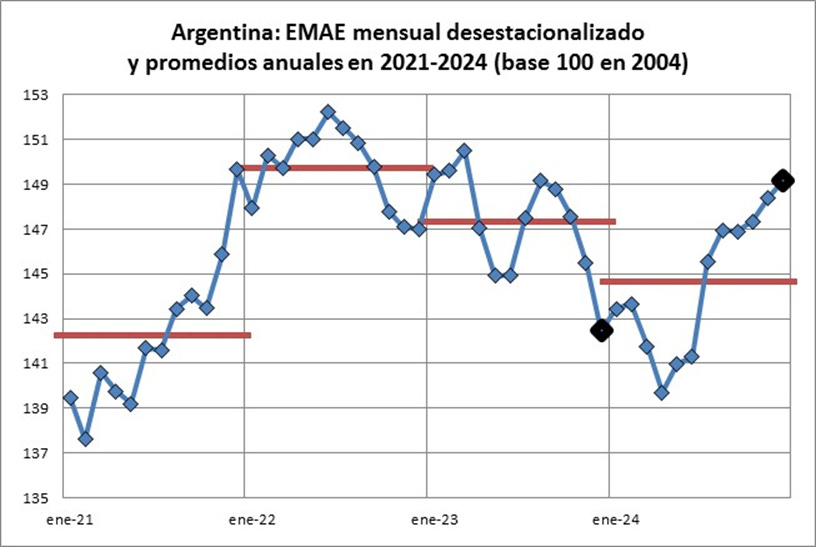 Uno, según el INDEC, el EMAE cayó 1,8% entre (los promedios de) 2023 y 2024. O sea que el dato habitualmente manejado sobre la evolución de una economía en un año fue ese: -1,8%.