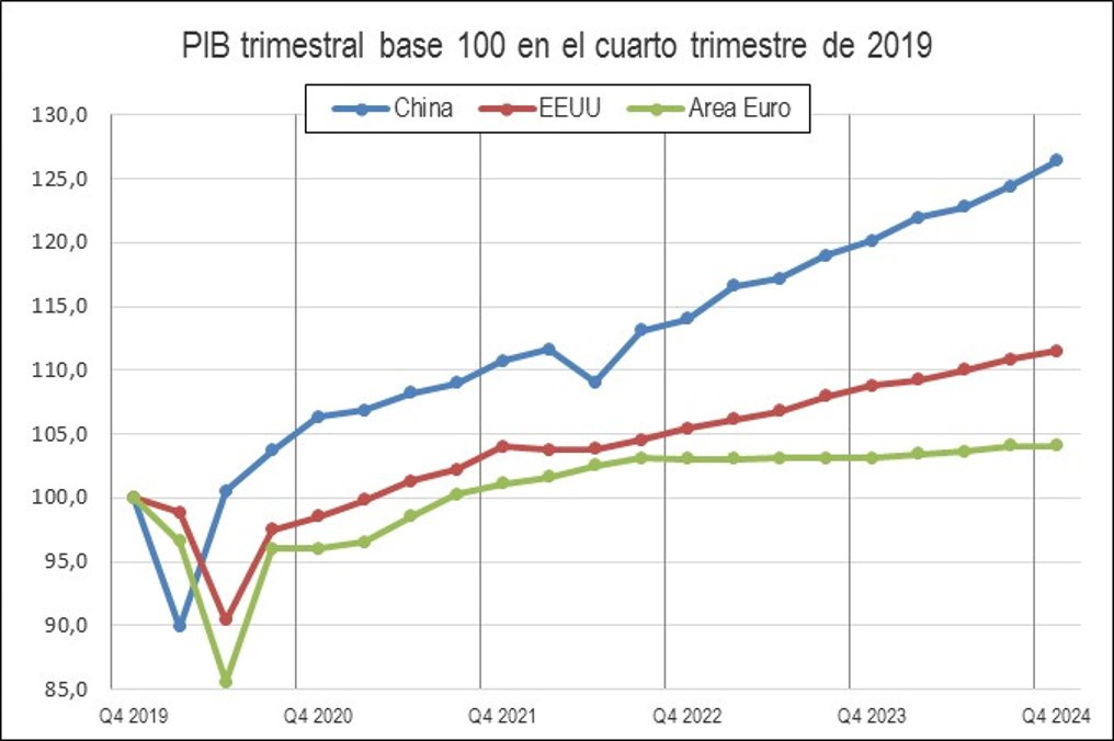 Dichas tasas no difieren sustancialmente de las que hubo en el promedio de los últimos cinco años, cuando se acumularon tasas de crecimiento (de punta a punta, entre los cuartos trimestres de 2019 y 2024) de 26,4% en China, de 11,5% en los Estados Unidos y de apenas 4,1% en el Área Euro.