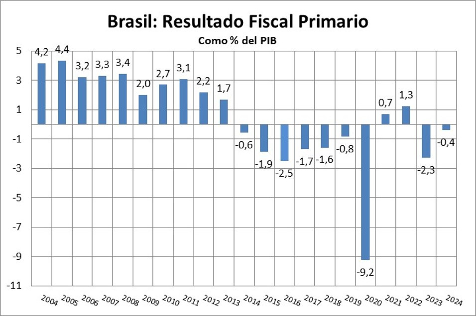 En 2024 Brasil tuvo un déficit fiscal primario (antes de considerar los pagos de intereses) de 0,40% del PIB y pagó intereses nominales por 8,05% del PIB, por lo que el déficit nominal alcanzó a 8,45% del PIB.